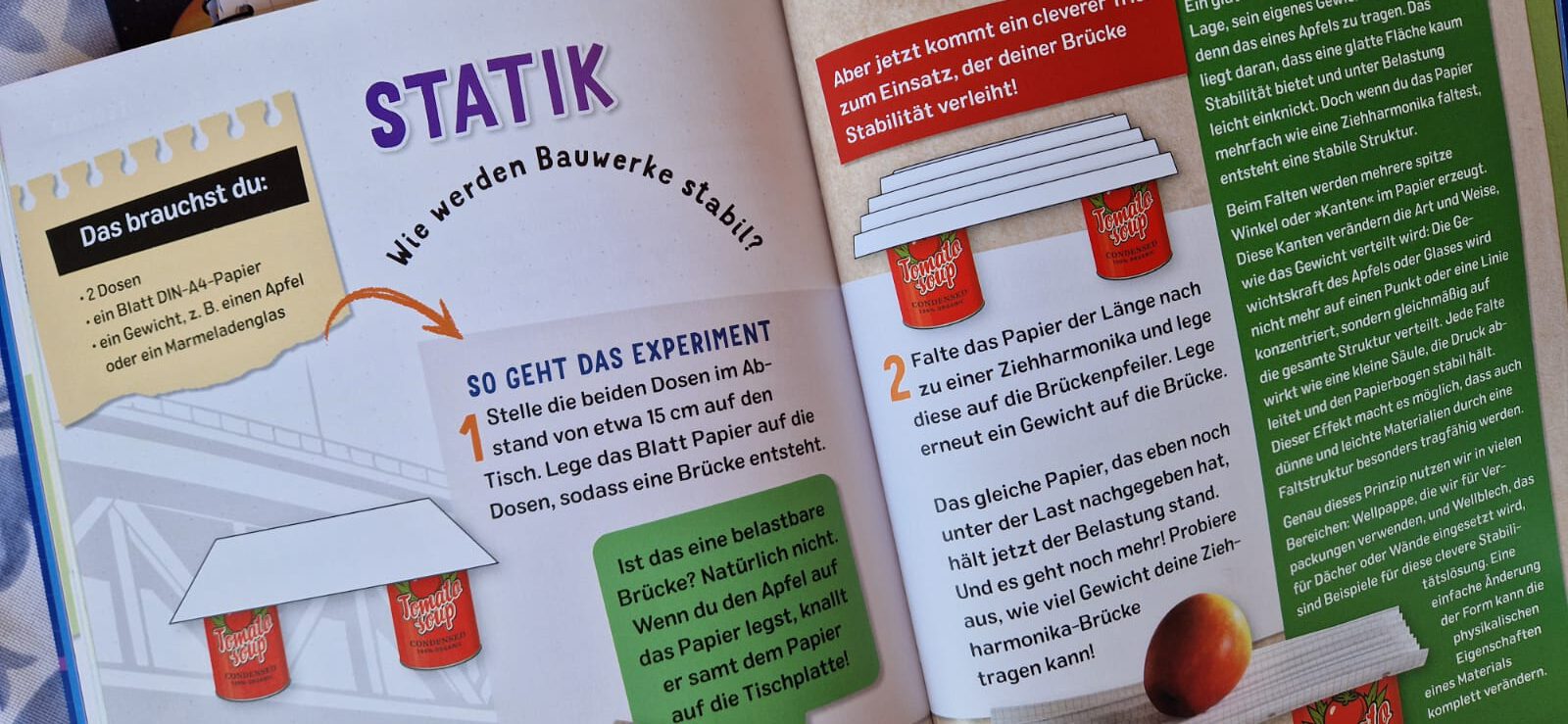 Hier in diesem Buch finden wir 50 Experimente, die wir mit ganz einfachen Hilfsmitteln (die oft jeder Haushalt vorrätig hat) durchführen können. Z.B. benötigen wir für ein Experiment zur Statik nur ein Blatt DIN-A4- Papier, 2 (Konserven-) Dosen und ein beliebiges Gewicht. Mit diesen Materialien und einfachen Skizzen wird der Versuch Schritt für Schritt erklärt und nachher in einem Merkkasten genau erklärt, was passiert ist.