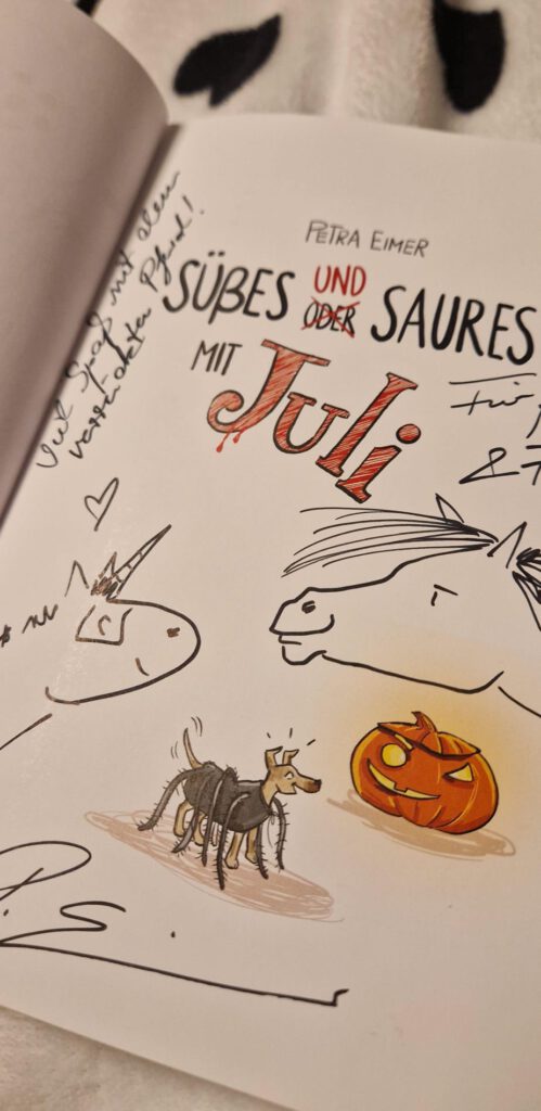… „Juli gibt es wirklich und ich habe sie spontan gekauft…dieses verrückte, tolle Pferd, um das es hier geht. Magst du sie lesen? Warte, ich besorge dir eines meiner Bücher“. Diese Worte galten meinem Sohn Alf und danach ging Petra kurz weg und kam mit diesem wunderbaren Buch zurück. Als Krönung gab es eine wunderschöne Signatur für Alf und Ulf und natürlich ein lustiges Foto.