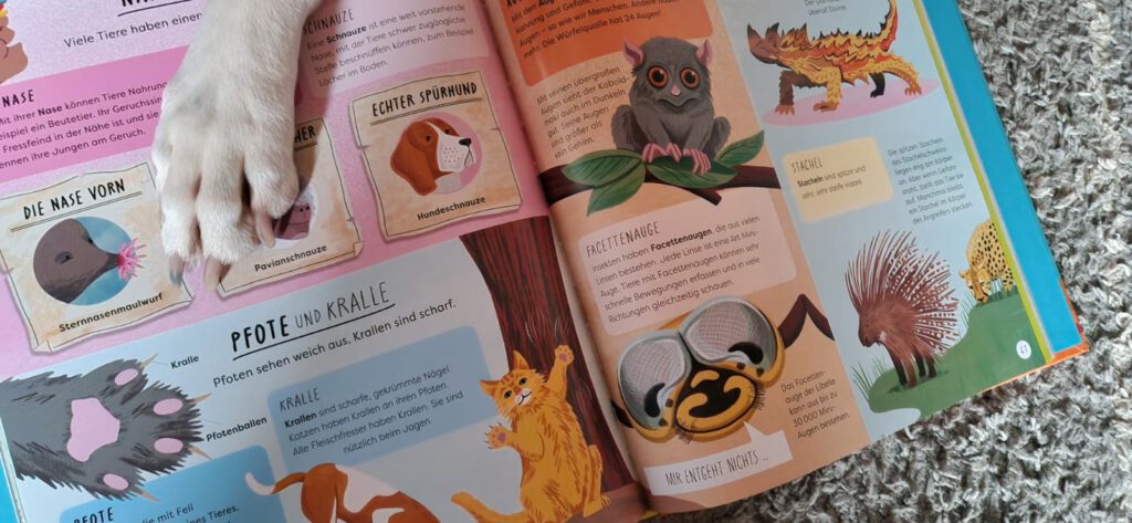 Sind Schnauzen und Nasen das gleiche? Wieso sagt man einmal Pfoten und dann Krallen? Sind Augen und Facettenaugen die gleichen? So viele und noch mehr Fragen werden in diesem Buch beantwortet. Mal ist es uns als Erwachsene klar aber wir wissen nicht genau wie wir unseren Kindern den Unterschied erklären sollen. Oder sind manche Begriffe selbst für uns gleich? Wie z.B. der Berühmte Krokodil und Alligator unterschied (man erkennt bzw. kann sie gut an der Schnauze unterschieden). Alle Begriffe sind mit Comic erklärt und das ganze kurz und knapp, was mich sehr erfreut, denn so kann ich die Texte ohne das Langeweile aufkommt mal kurz vorlesen und zum Teil selber etwas lernen.